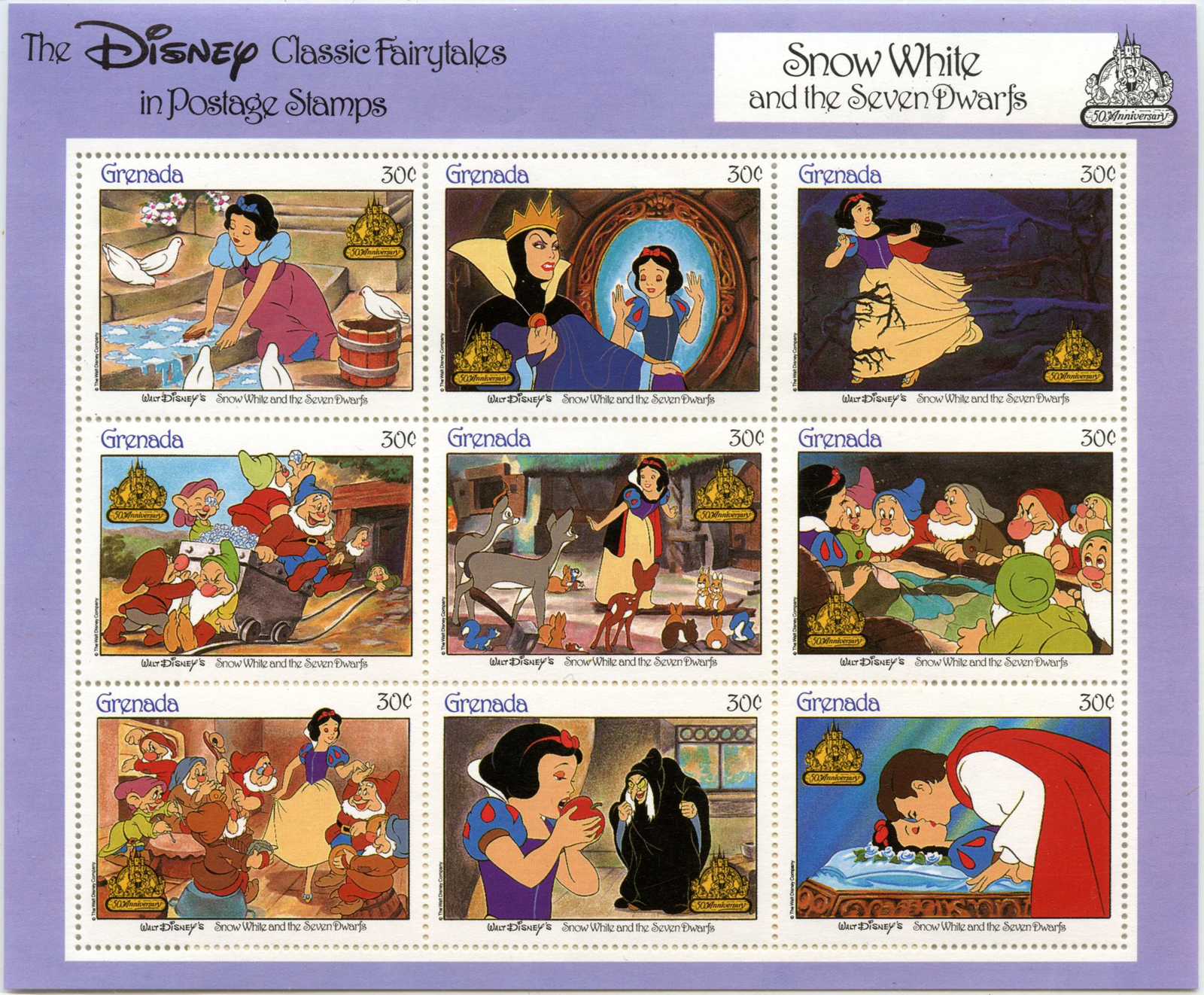 But drawing a cartoony Snow White didn't allow for the full range of emotions Walt Disney wanted, so Grim Natwick was brought in (these names!), the same guy who had created Betty Boop in 1930. Johnson says it was Grim who made Snow so fashionable "with a kind of thirties model face, with its plucked and highly-curved eyebrows." (FYI: Johnson says you can watch the change from cartoon in the first dwarf scenes to fashion plate to another, more lifelike girl at the end drawn by guy named Campbell. You can kind of see that here with these stamps of the movie.)
